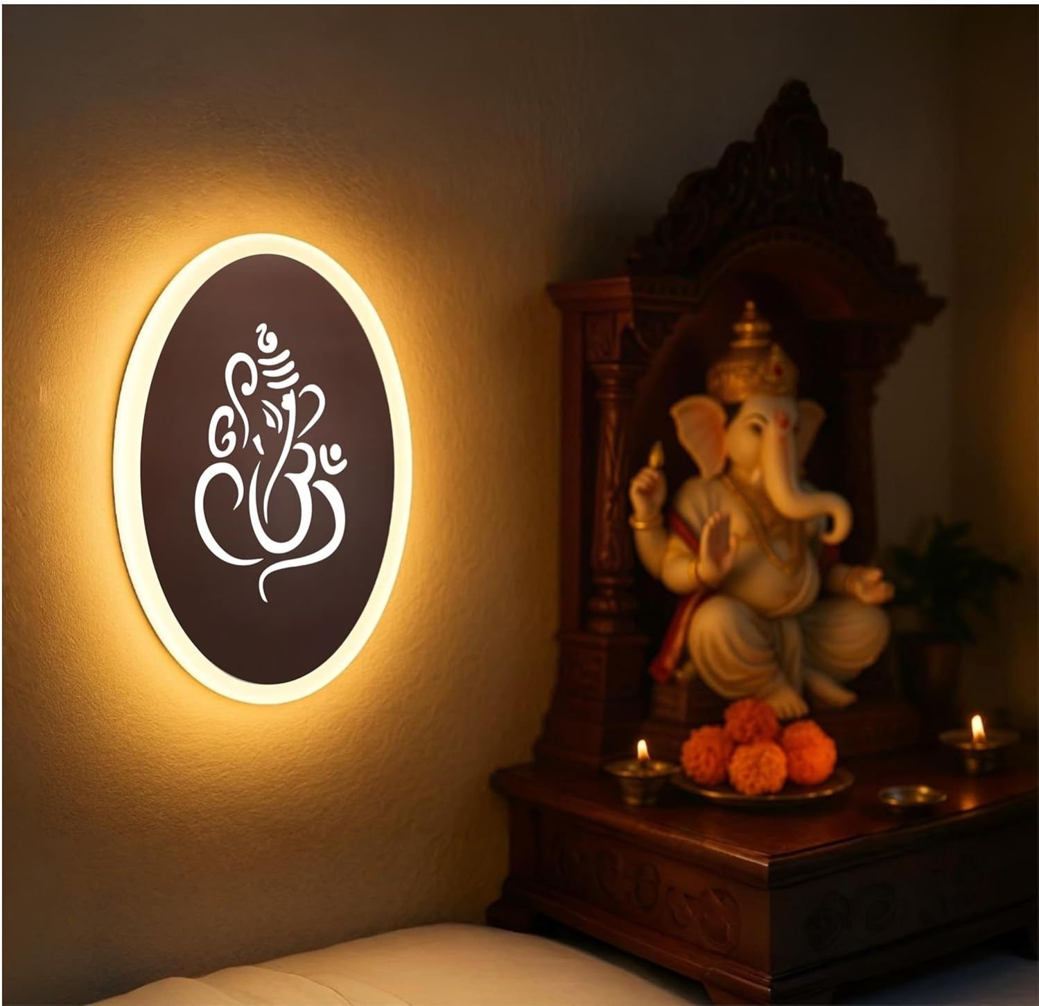 Bring divine elegance to your space with BUYMOOR® Ganpati LED Wall Light. Designed with a rose gold oval frame and frosted acrylic, it radiates a warm white glow that enhances serenity in pooja rooms, temples, living rooms, and hotels. Durable, energy-efficient, and decorative – the perfect blend of spirituality and style.