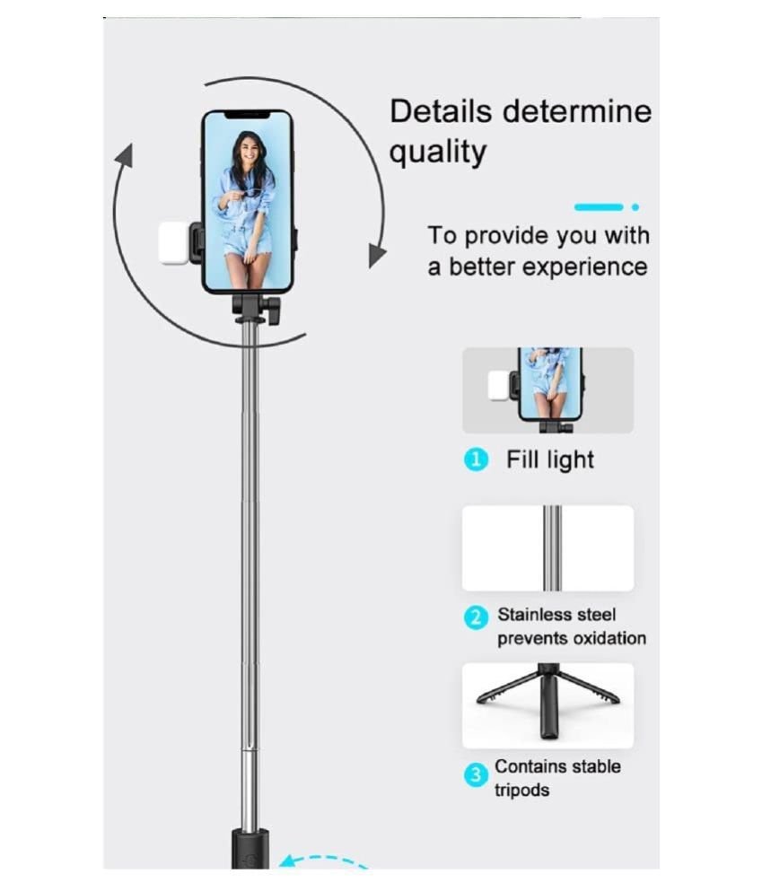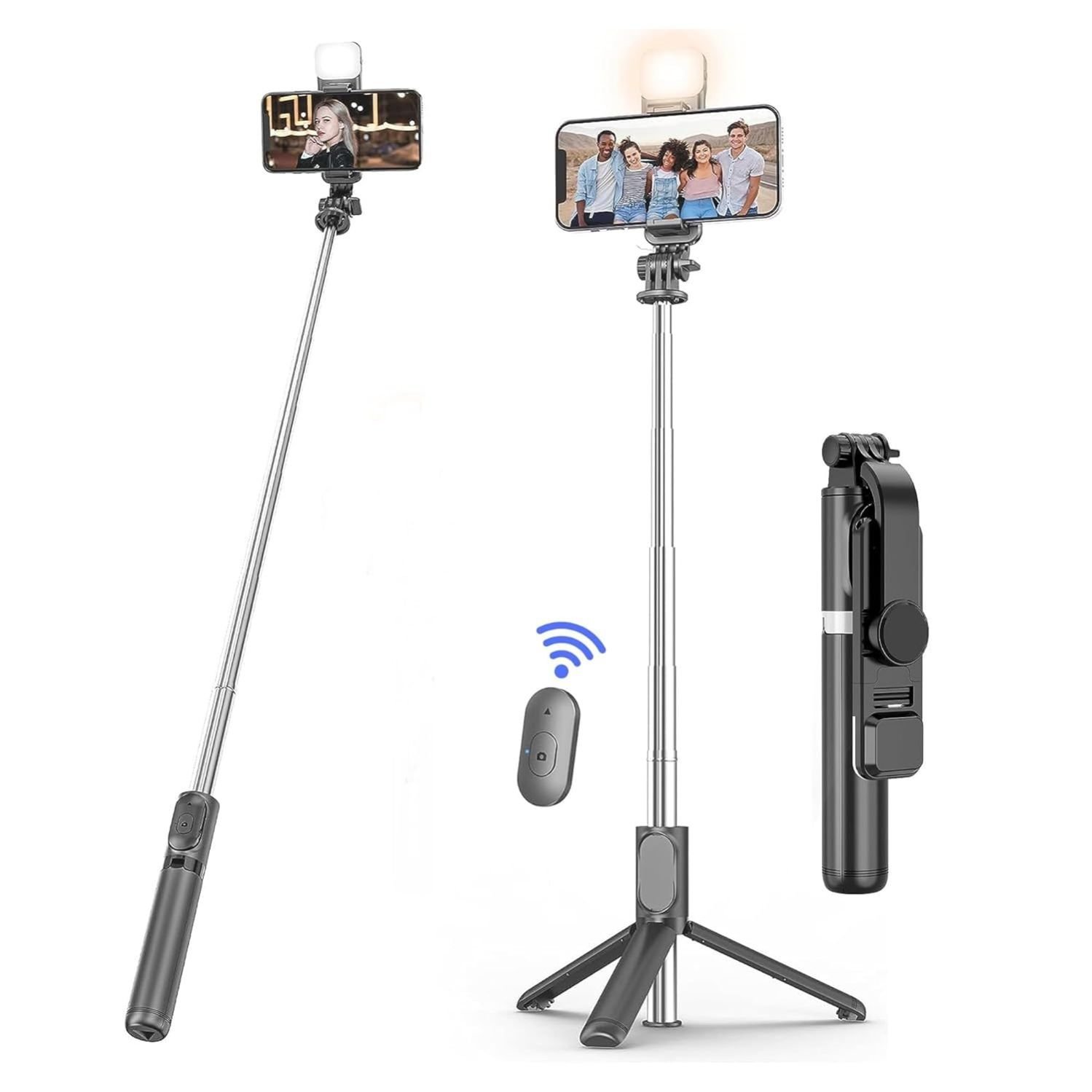 and wireless remote for easy shooting flexibility.\r\n• ???? Built-in LED Light: Adjustable brightness helps you capture clear and beautiful selfies even in low light.\r\n• ???? Extendable & 360° Rotation: Adjustable stick length and rotatable phone holder ensure perfect angles for every shot.\r\n• ???? Wireless Bluetooth Remote: Detachable remote control with up to 10 meters range—ideal for group shots.\r\n• ???? Universal Compatibility: Works seamlessly with all iPhone and Android smartphones.\r\n• ???? Sturdy & Lightweight: Premium-grade aluminum alloy design for durability with a portable foldable body.